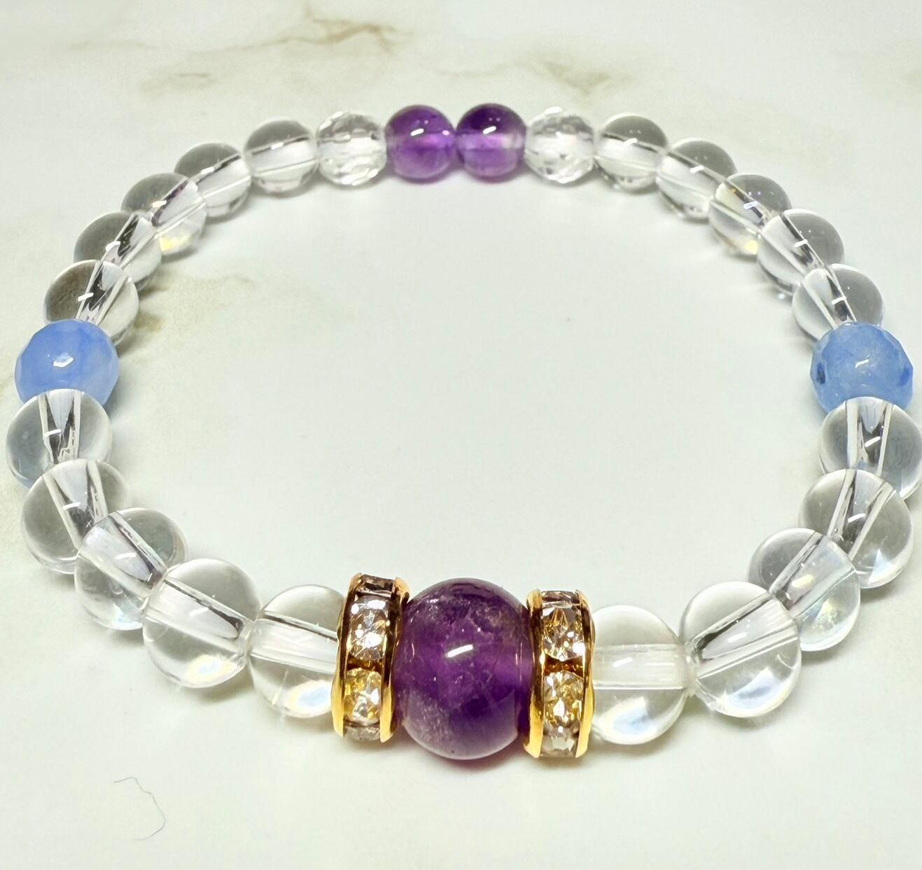 サンゴの生命力、アメジストの癒し、そしてブルージェイドの穏やかな波動。これらの石の力が水晶の調和作用によって高められ、あなたの心身のバランスを整え、健やかな毎日をサポートします。ストレスを軽減し、内なる生命力を高め、深い安らぎをもたらしてくれるでしょう。